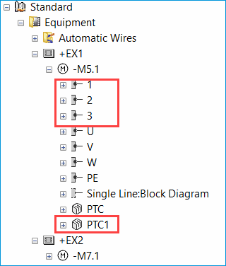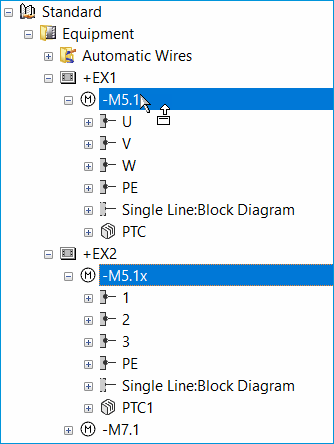 Once +EX2 -M5.1x is copied and merged with +EX1 -M5.1, +EX1 -M5.1 also has the pins of +EX2 -M5.1x. As the merge references in the source and destination objects match for the PE and Single Line:Block Diagram pins, these pins are not copied into the structure of +EX1 -M5.1.