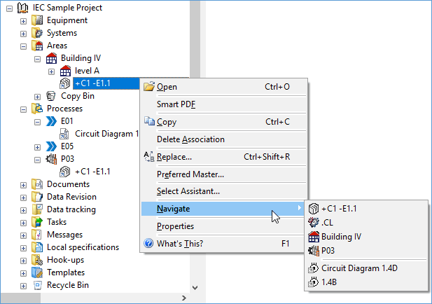 In the Engineering Base databases, various assignments and associations exist between individual objects and between shapes and objects. Using the Navigate function, you can navigate from one object to another object via these associations (assignments and associations).