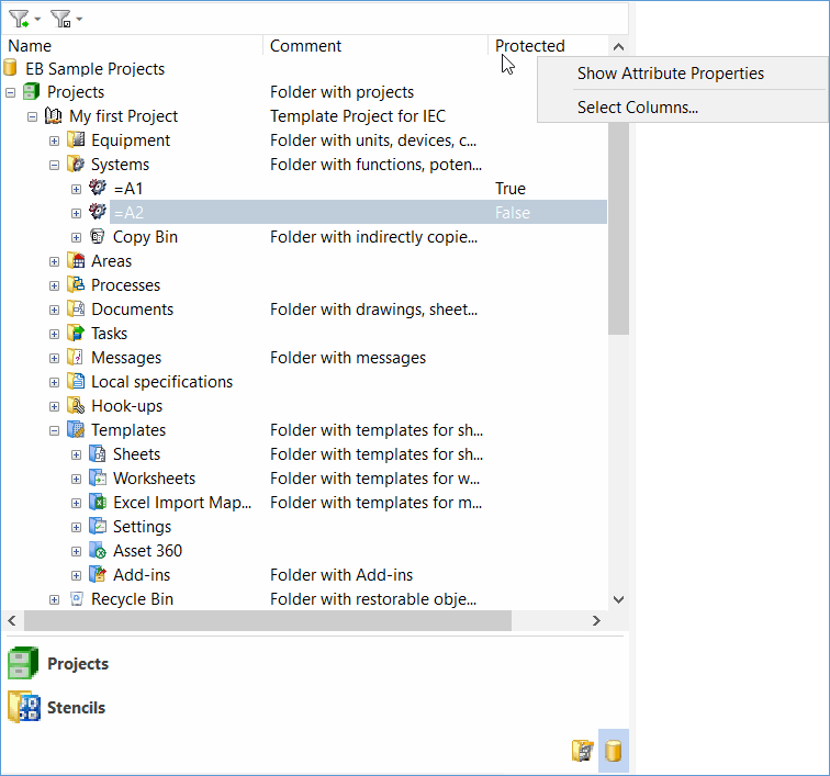The content of Boolean attributes, e.g. attribute Protected, is represented as True (selected) or False (not selected).