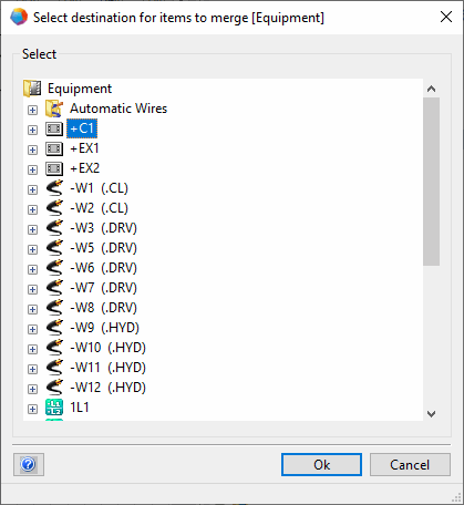 By using drag and drop, you can copy drawings or sheets within a project or from one project to another and merge equipment of the associated objects. This copies the drawing or sheet and merges the objects of the source with the objects of the target.
