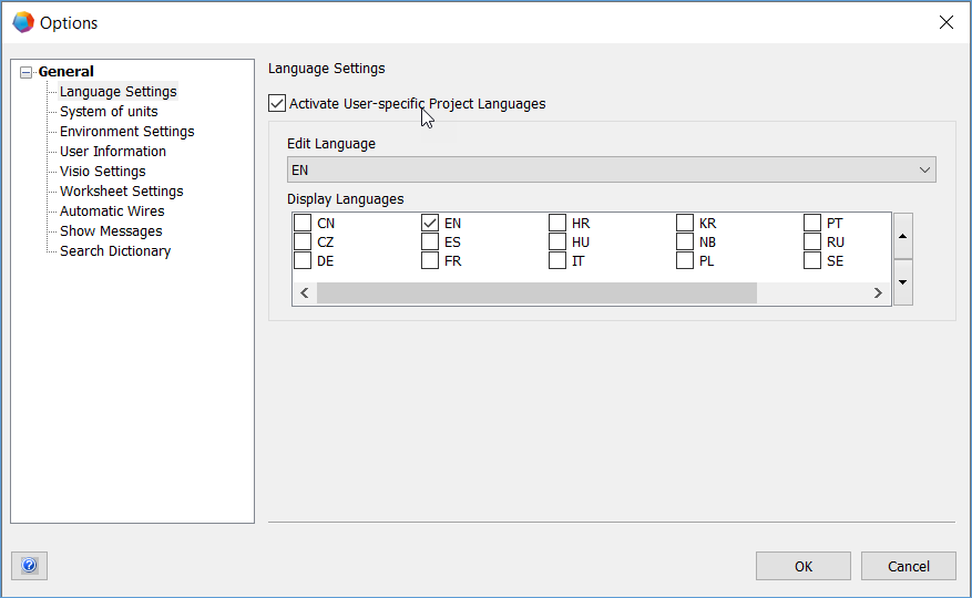 As in the project settings, each user can select an editing language and several display languages on the database level (in the Options under Language Settings). These settings are valid individually for a user and can be switched on or off via the checkbox Activate User-Specific Project Languages. After confirmation of the dialog they are immediately visible in the project data, especially in the documents, and are again active after an Engineering Base restart.