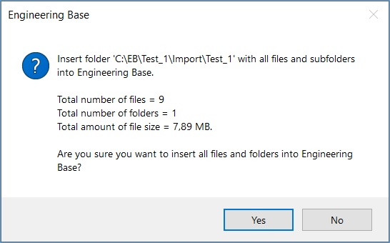 - If your import includes at least one directory, the dialog Engineering Base opens. If you want to execute the import, confirm the dialog by clicking Yes, otherwise click No to cancel it.