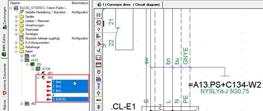 2. Ziehen Sie mit der gedrückten linken Maustaste die markierten Adern mit Drag & Drop vom BMK-Editor auf das gewünschte Symbol in der Zeichnung.